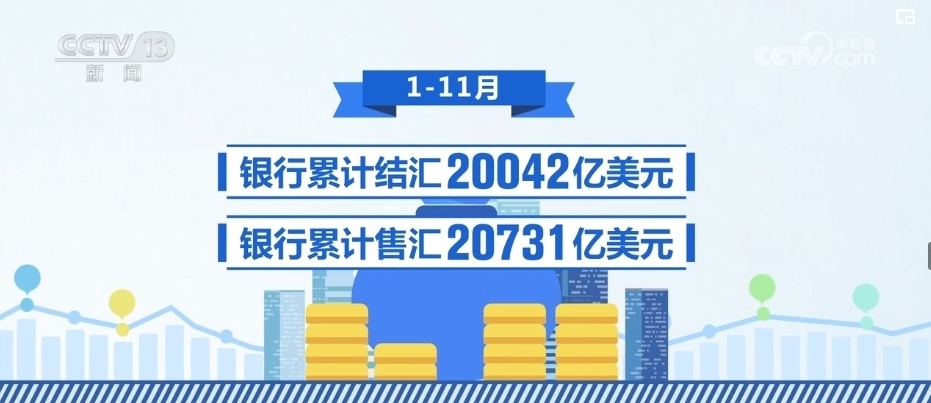國家外匯管理局最新數(shù)據(jù)顯示,11月,銀行結(jié)匯1735億美元,售匯1981億美元。1—11月,銀行累計結(jié)匯20042億美元,累計售匯20731億美元。