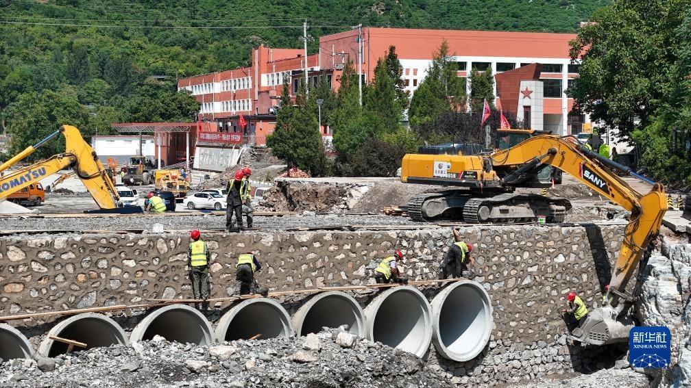 在北京市房山區(qū)霞云嶺中心小學(xué),北京建工機(jī)施集團(tuán)的施工人員在搶建供學(xué)校與外界通行的新橋梁(2023年8月23日攝,無(wú)人機(jī)照片)。新華社記者 鞠煥宗 攝