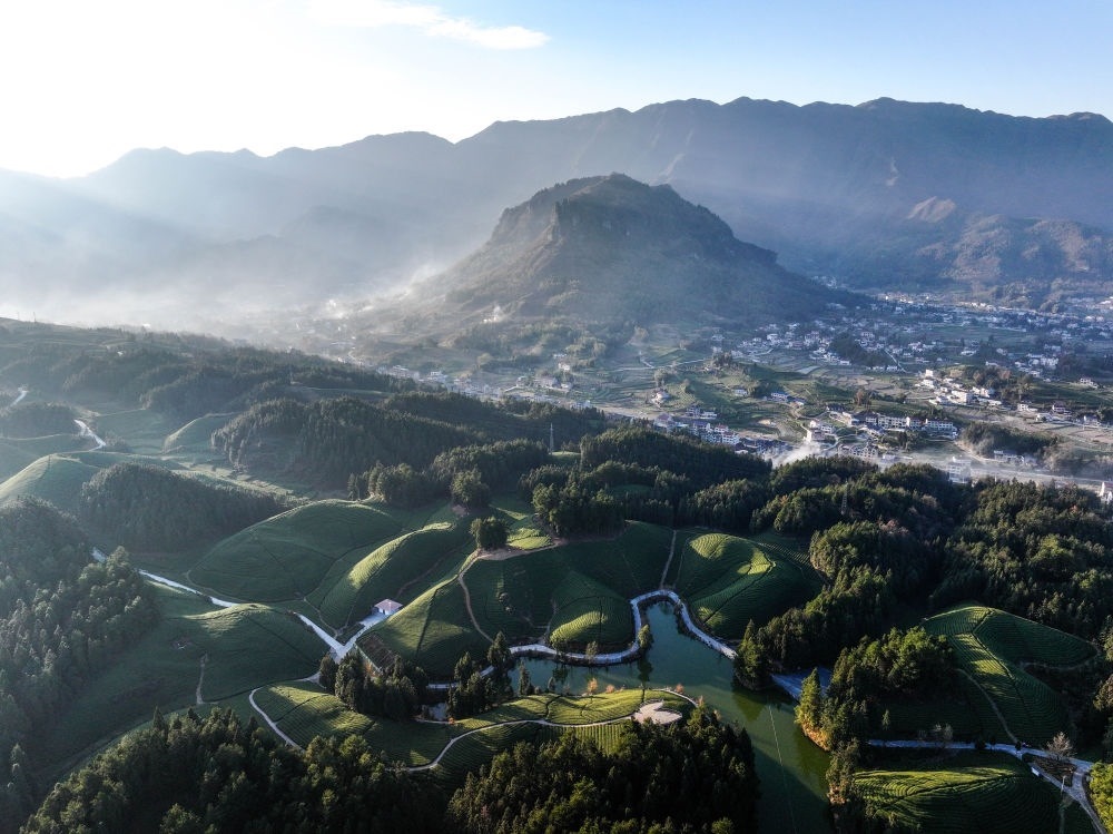 這是2023年12月5日拍攝的湖北省鶴峰縣走馬鎮(zhèn)楊柳池茶園風(fēng)光(無(wú)人機(jī)照片)。新華社記者 楊文斌 攝