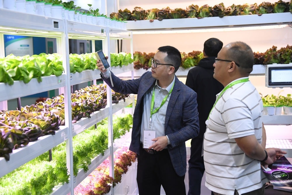 2023世界農(nóng)業(yè)科技創(chuàng)新大會(huì)11月2日至4日在北京舉行。這是2023年11月2日,工作人員(左)在世界農(nóng)業(yè)科技博覽會(huì)現(xiàn)場(chǎng)介紹智慧植物工廠。新華社記者 任超 攝