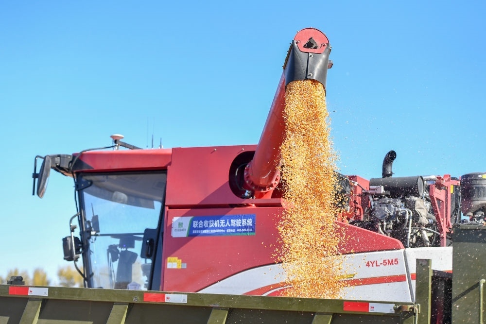 在中國(guó)科學(xué)院“黑土糧倉(cāng)”科技會(huì)戰(zhàn)長(zhǎng)春示范區(qū)公主嶺示范基地,無(wú)人駕駛農(nóng)機(jī)將收獲的玉米裝車(chē)(2023年10月19日攝)。新華社記者 張楠 攝