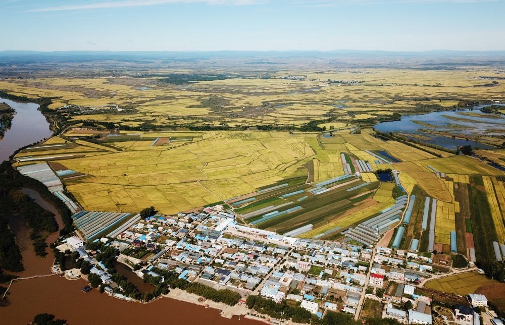 這是2023年9月13日拍攝的黑龍江省寧安市渤海鎮(zhèn)小朱家村附近的稻田(無(wú)人機(jī)照片)。新華社記者 王建威 攝