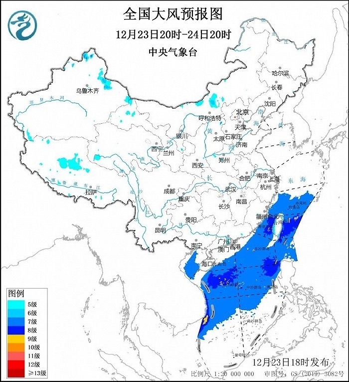 中央氣象臺12月23日18時繼續(xù)發(fā)布大風(fēng)藍色預(yù)警:預(yù)計,12月23日20時至24日20時,東海南部海域、臺灣海峽、臺灣以東洋面、巴士海峽、南海大部海域、北部灣將有7~8級、陣風(fēng)9~10級的東北風(fēng),其中南海西南部的部分海域風(fēng)力可達9級、陣風(fēng)10級。