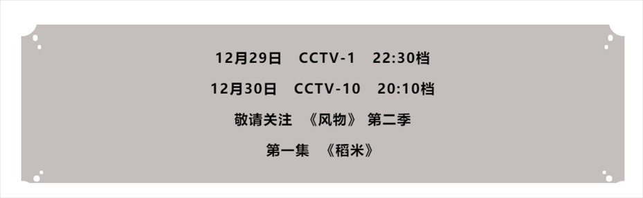 2023年12月29日起,紀(jì)錄片《風(fēng)物》(第二季)的七期節(jié)目將在央視綜合頻道CCTV-1 晚間 22:30檔,陸續(xù)播出。第二季節(jié)目秉持著《風(fēng)物》第一季的創(chuàng)作理念,用獨(dú)具特色的精美鏡頭、貫穿古今的風(fēng)物故事、地跨南北的格局視角,展現(xiàn)了中國大地獨(dú)具特色的風(fēng)物特產(chǎn)。節(jié)目以習(xí)近平文化思想為統(tǒng)領(lǐng),通過挖掘七種中華大地上最具代表性的時令特產(chǎn),展現(xiàn)其深層的文化邏輯、歷史根脈和生活智慧,以獨(dú)特的文化擔(dān)當(dāng)、強(qiáng)烈的文化自信,生動描摹了一幅幅獨(dú)特鮮活的“中國風(fēng)物版圖”,打造了一部部影像版“國家風(fēng)物畫卷”,揭示了中華優(yōu)秀傳統(tǒng)文化中天人合一、萬物和諧共生的文化理念和價值追求。