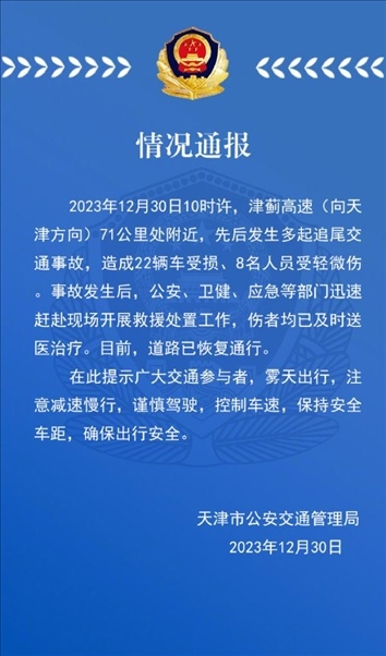 ·津薊高速發(fā)生多起追尾交通事故,警方通報:致22輛車受損、8人輕微傷。