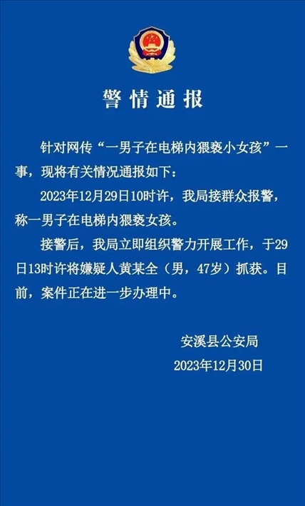 ·網(wǎng)傳“一男子在電梯內(nèi)猥褻小女孩”,福建安溪警方:47歲男子被抓獲。