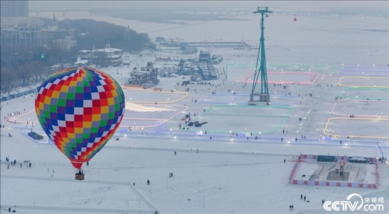 近日,哈爾濱松花江冰面上升起一個顏色鮮艷的熱氣球。