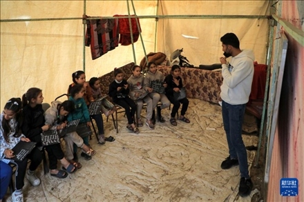 受新一輪巴以沖突影響,加沙地帶許多學(xué)校被用來收留無家可歸的民眾,學(xué)生們只能在臨時搭建的教室中學(xué)習(xí)。