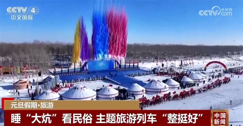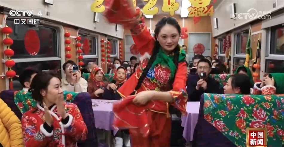 總臺央視記者 楊曜語:我即將登上的列車就是從哈爾濱開往漠河的國內(nèi)首個沉浸式東北民俗文化體驗(yàn)列車,坐過的人都說一上車就想盤腿兒了,我們趕緊來體驗(yàn)一下!一上車我就被濃濃的東北文化所感染到了,整個車廂都被東北大花的經(jīng)典配色裝飾著,再加上隨手就能品嘗到東北特色美食,坐在床鋪上就感覺一秒鐘“穿越”到農(nóng)家炕頭。