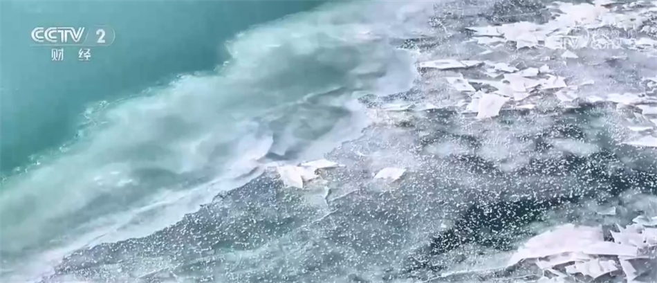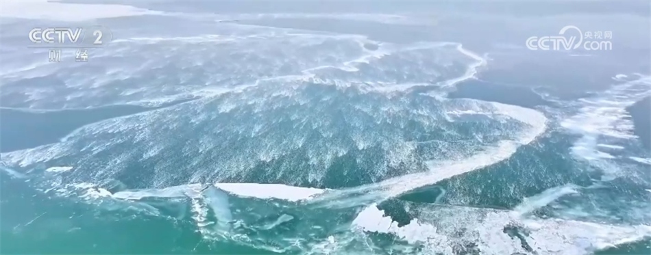 從空中俯瞰,金色的沙灘、潔白的冰線、剔透的碎冰以及蔚藍(lán)的湖面,共同構(gòu)成一幅色彩明艷的線條畫(huà)。