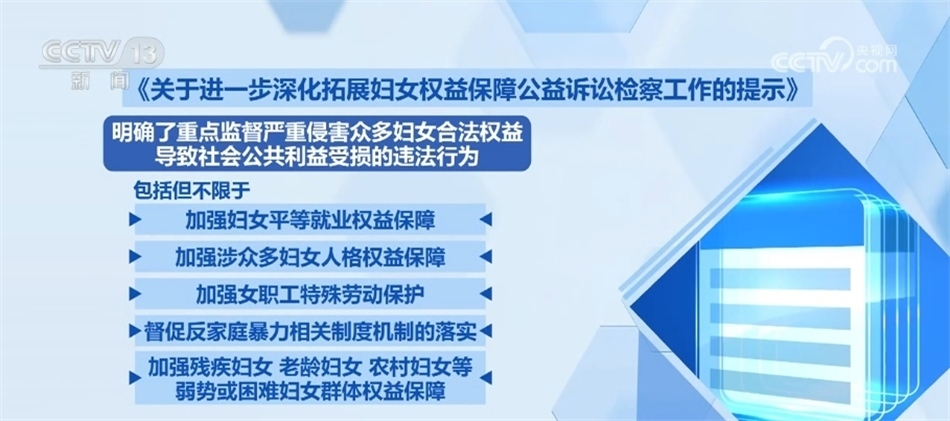 央視網(wǎng)消息:最高人民檢察院今天(1月4日)發(fā)出《工作提示》,要求逐步拓展婦女權(quán)益保護(hù)公益訴訟辦案規(guī)模,推動(dòng)?jì)D女權(quán)益保障法、反家庭暴力法、女職工勞動(dòng)保護(hù)特別規(guī)定等法律法規(guī)統(tǒng)一正確實(shí)施,為婦女權(quán)益保護(hù)提供有力法治保障。