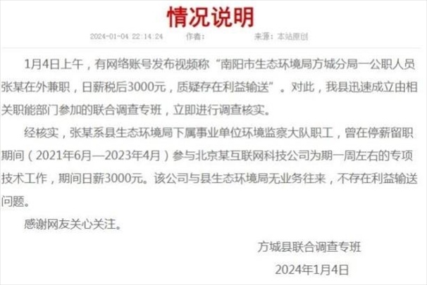 ·南陽(yáng)調(diào)查“公務(wù)員兼職日薪三千”:停薪留職期間曾參與一周專項(xiàng)技術(shù)工作,不存在利益輸送。