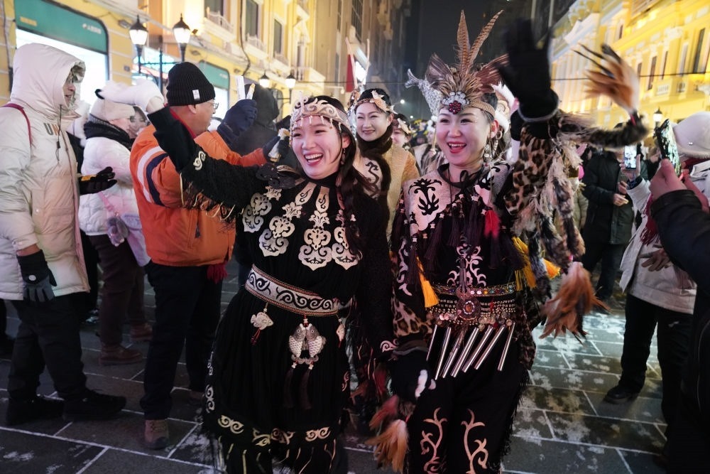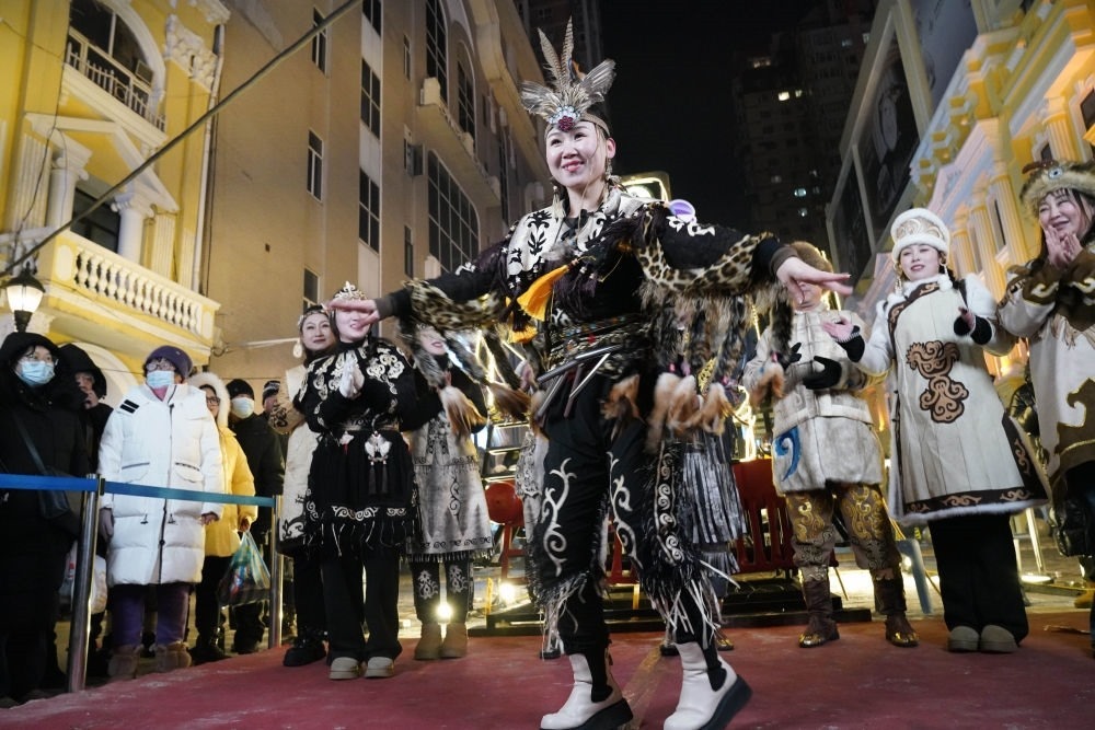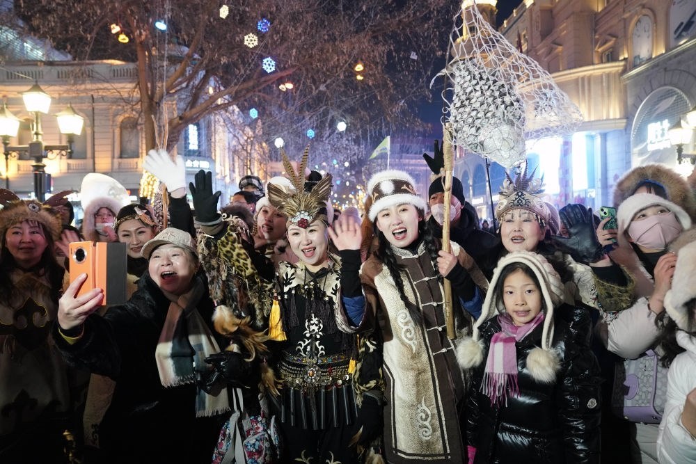 ↑1月6日,身著赫哲族服飾的赫哲族群眾在哈爾濱中央大街上與游客互動(dòng)。