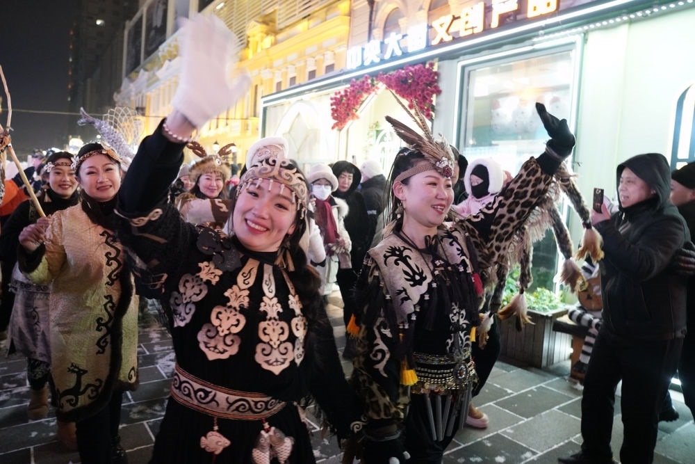 ↑1月6日,身著赫哲族服飾的赫哲族群眾和饒河縣文旅推薦官在哈爾濱中央大街上與游客互動(dòng)。