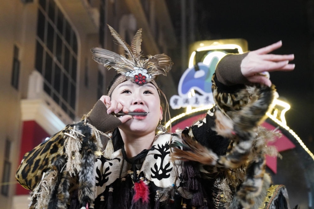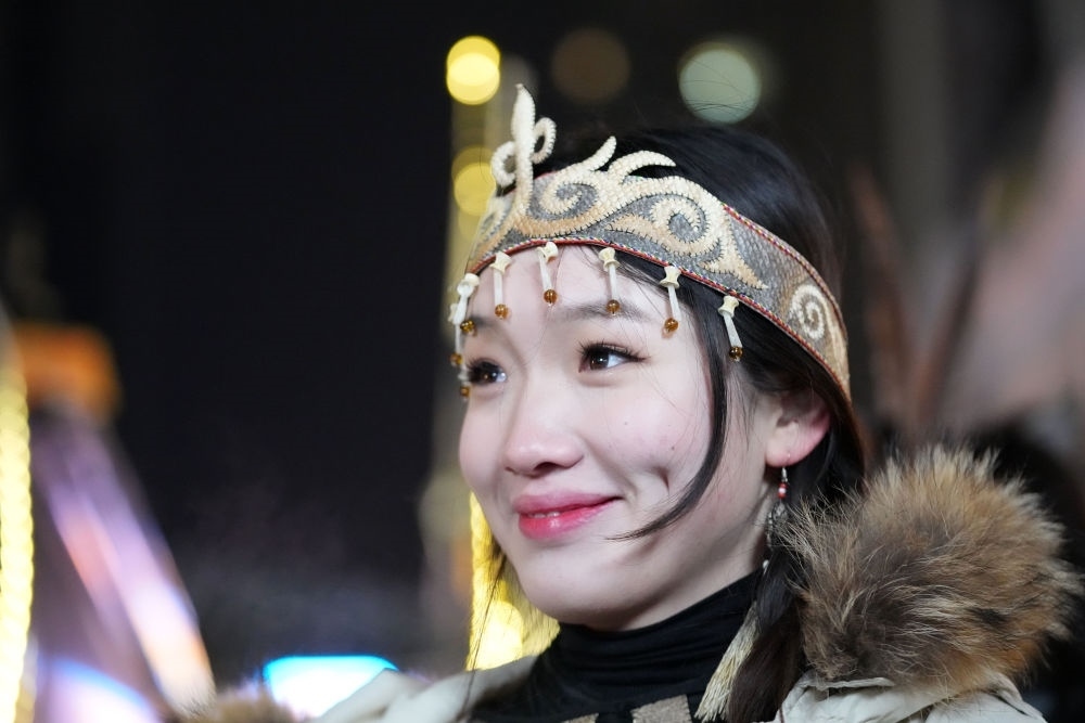 ↑1月6日,戴著魚(yú)皮頭飾的赫哲族姑娘在哈爾濱中央大街上參與家鄉(xiāng)推介活動(dòng)。