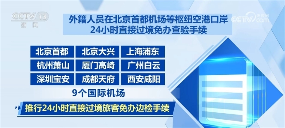 外籍人員在北京首都機場等樞紐空港口岸24小時直接過境免辦查驗手續(xù)。在北京首都、北京大興、上海浦東、杭州蕭山、廈門高崎、廣州白云、深圳寶安、成都天府、西安咸陽9個國際機場,推行24小時直接過境旅客免辦邊檢手續(xù)。對于持24小時內(nèi)國際聯(lián)程機票,經(jīng)上述任一機場過境前往第三國或地區(qū)的出入境旅客,可以免辦邊檢手續(xù),直接免簽過境。