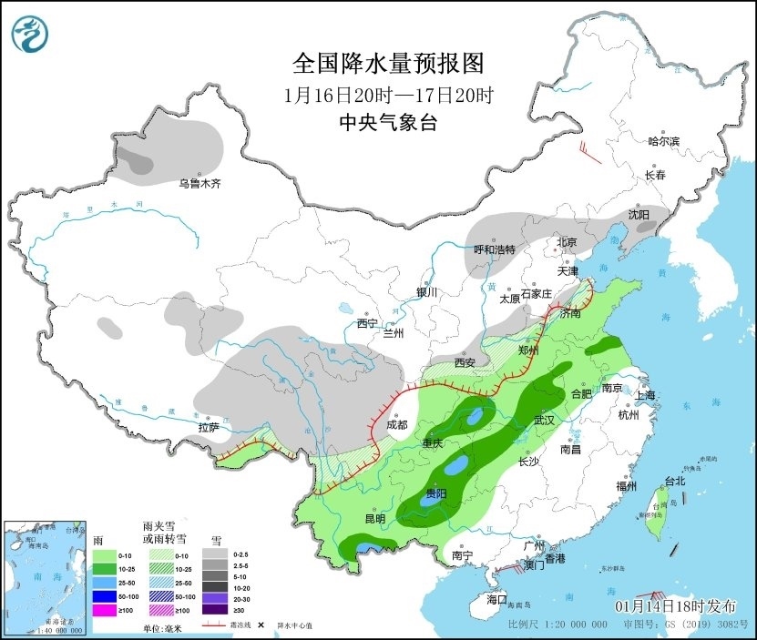 1月16日20時(shí)至17日20時(shí),新疆西部、青海南部、西藏東部、內(nèi)蒙古中部、遼寧中南部、河北北部、川西高原、陜西南部、山西南部、河南西北部、山東西北部、云南西北部等地的部分地區(qū)有小到中雪或雨夾雪;黃淮大部、江淮大部、江漢、江南西部、四川東部、重慶、貴州、云南、廣西西部、臺(tái)灣島等地的部分地區(qū)有小到中雨,其中湖北西南部、貴州中部和東北部、云南南部等地的部分地區(qū)有大雨。內(nèi)蒙古東南部等地的部分地區(qū)有4~5級(jí)風(fēng)(見(jiàn)圖3)。