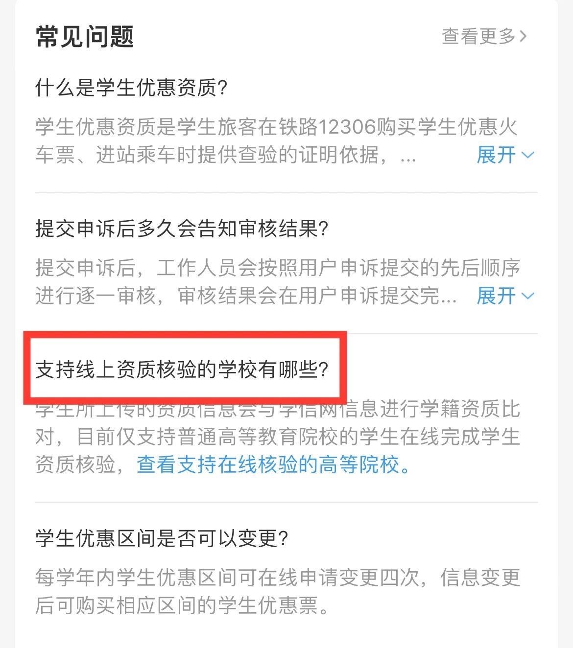 打開鐵路12306App,右下角進(jìn)入“我的”頁面,在學(xué)生資質(zhì)填寫頁面的“常見問題”中,找到“支持線上資質(zhì)核驗(yàn)的學(xué)校有哪些?”即可查看支持在線核驗(yàn)的學(xué)校名單。