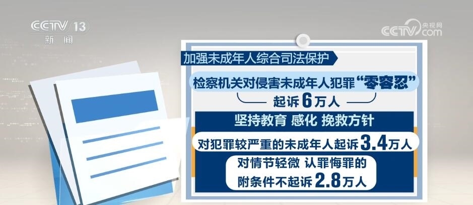 加強未成年人綜合司法保護。檢察機關對侵害未成年人犯罪“零容忍”,起訴6萬人。堅持教育、感化、挽救方針,對犯罪較嚴重的未成年人起訴3.4萬人;對情節(jié)輕微、認罪悔罪的,附條件不起訴2.8萬人。部署加強犯罪預防工作,推動罪錯未成年人分級干預,協調推動專門學校建設,依法矯治有嚴重不良行為的未成年人。