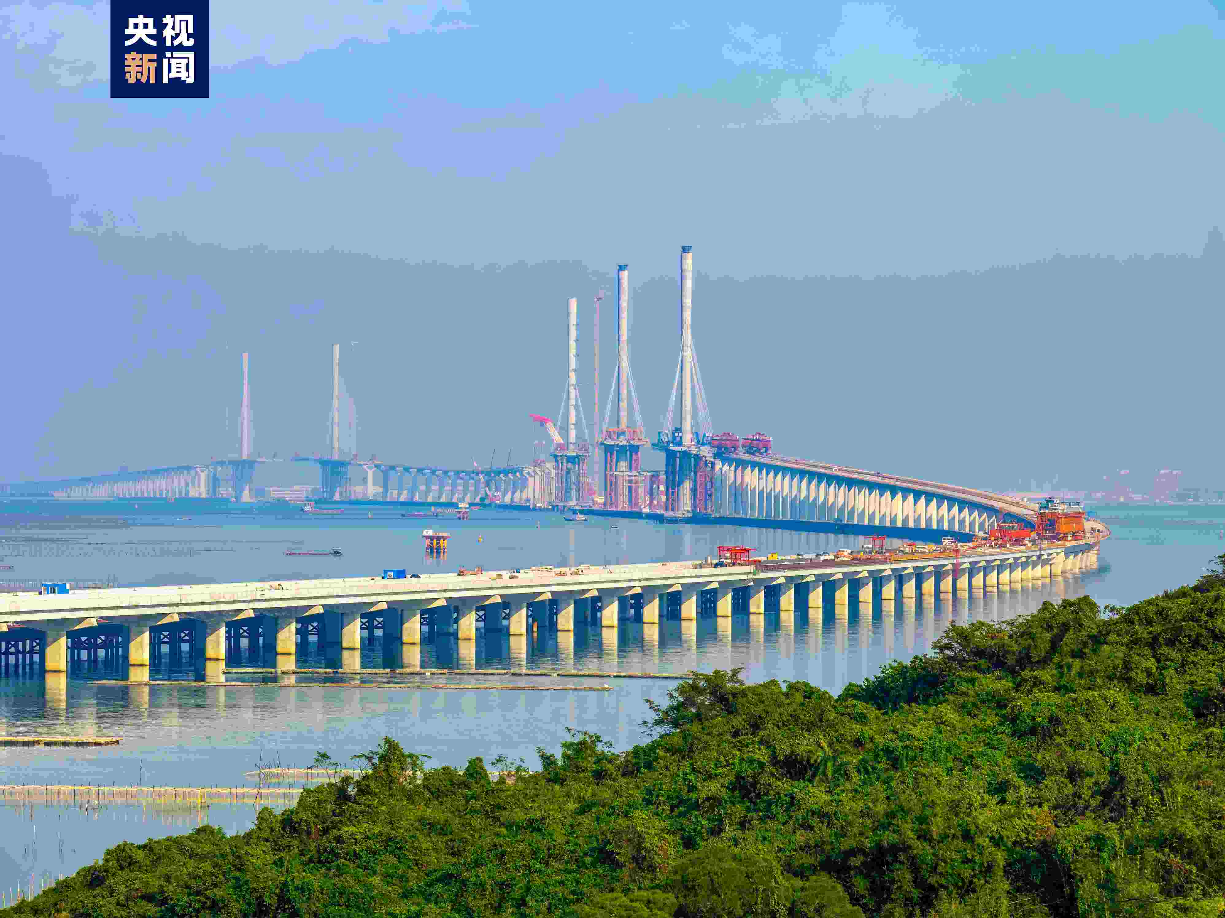 截至目前,黃茅??绾Mǖ赖奈遄魉蛢勺淼谰呀ㄔO(shè)完成,上部結(jié)構(gòu)施工持續(xù)進(jìn)行中,黃茅海大橋東塔鋼箱梁架設(shè)完成5節(jié)、中塔鋼箱梁架設(shè)完成9節(jié)、西塔鋼箱梁架設(shè)完成15節(jié);高欄港大橋東塔鋼箱梁架設(shè)完成31節(jié)、西塔鋼箱梁架設(shè)完成33節(jié)。