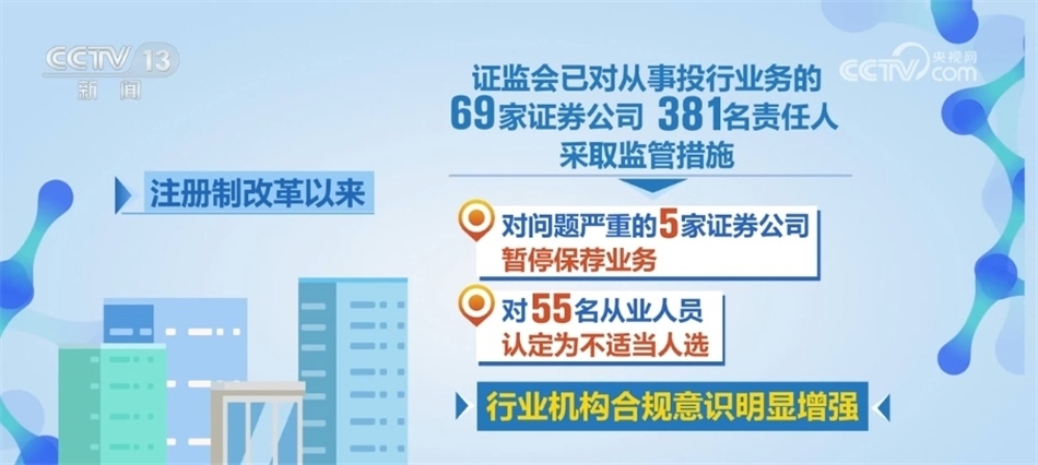 數(shù)據(jù)顯示,注冊制改革以來,證監(jiān)會已對從事投行業(yè)務(wù)的69家證券公司、381名責(zé)任人采取了監(jiān)管措施,特別是對問題嚴(yán)重的5家證券公司暫停保薦業(yè)務(wù),對55名從業(yè)人員認(rèn)定為不適當(dāng)人選,行業(yè)機構(gòu)合規(guī)意識明顯增強。