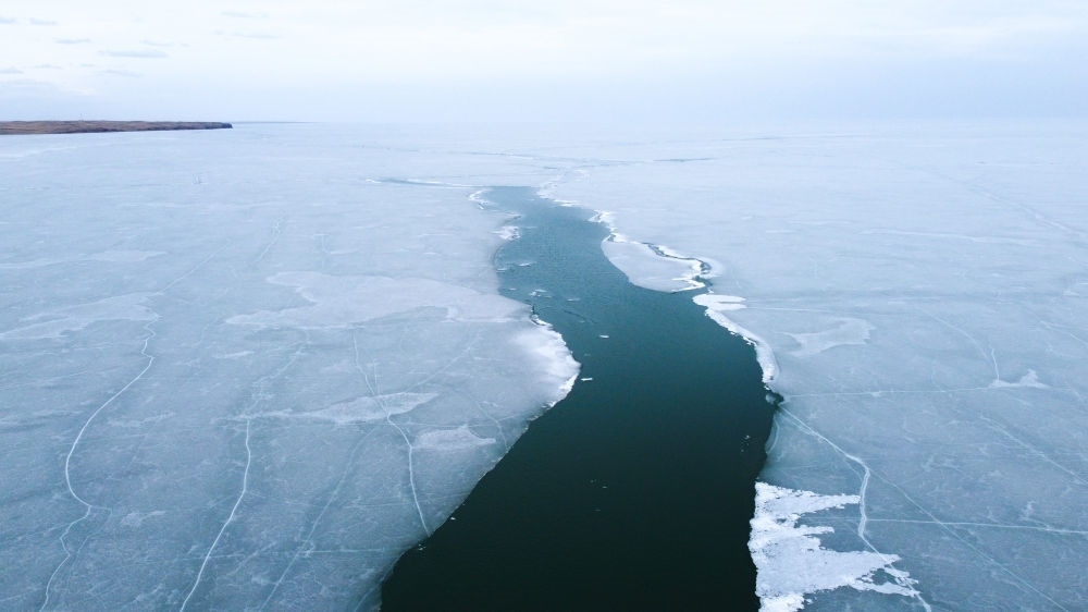 這是2023年4月17日拍攝的呼倫湖開湖景象(無人機照片)。新華社記者 王楷焱 攝