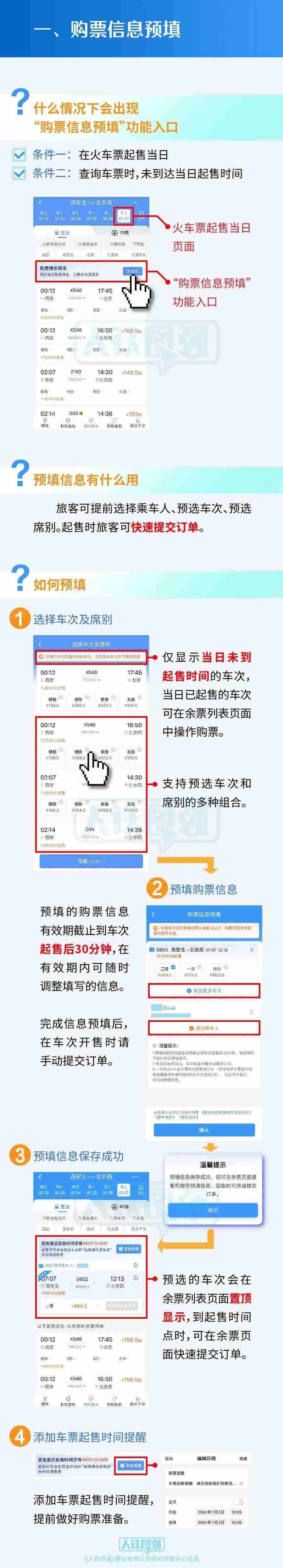 學(xué)生、務(wù)工人員通過(guò)鐵路12306專區(qū)購(gòu)買春運(yùn)期間火車票,可提交開車前17天(含)以上的出行購(gòu)票需求,最晚可預(yù)約3月5日的車票。符合條件的旅客朋友可在開車前17天23時(shí)前在12306手機(jī)客戶端提交購(gòu)票需求,在開車前16天查詢兌現(xiàn)結(jié)果,須在開車前第16天23時(shí)前,通過(guò)12306手機(jī)客戶端預(yù)約專區(qū)支付票款,逾期未支付的,訂單自動(dòng)取消;兌現(xiàn)成功后逾期未支付達(dá)到5次的,不再提供預(yù)約購(gòu)票服務(wù)。