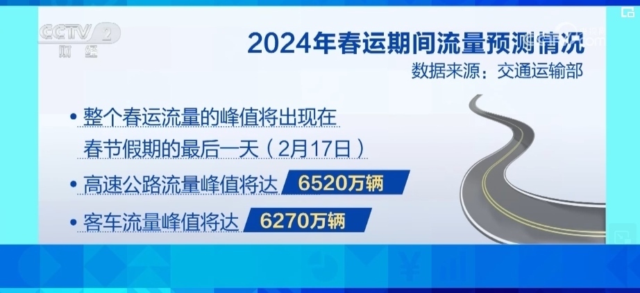 交通運輸部預計,2024年春運期間,全國公路網日均流量將達3720萬輛,比2023年同期增長7.5%。整個春運流量的峰值將出現在春節(jié)假期的最后一天,也就是2月17日,高速公路流量峰值將達6520萬輛,客車流量峰值將達6270萬輛。