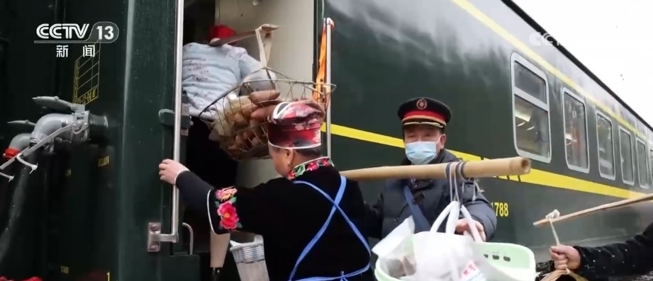央視網(wǎng)消息:買年貨,除了商超、集市,批發(fā)市場,還可以在火車上。在貴州,往返于貴陽與玉屏之間的5639/5640次列車,開行至今已有20多年,方便了沿途10多個(gè)小站的村民出行。