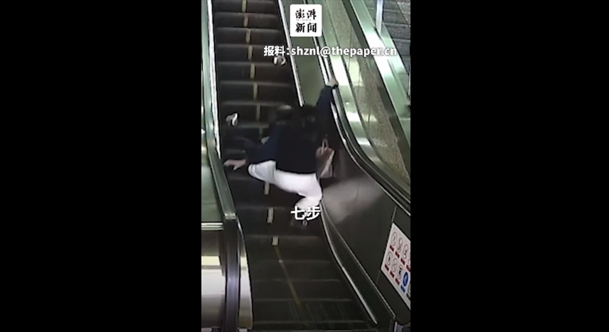 ·江蘇南京地鐵站內(nèi)一老人在乘坐扶梯時突然失去平衡,向后倒去,身后女子用七步護(hù)住老人。