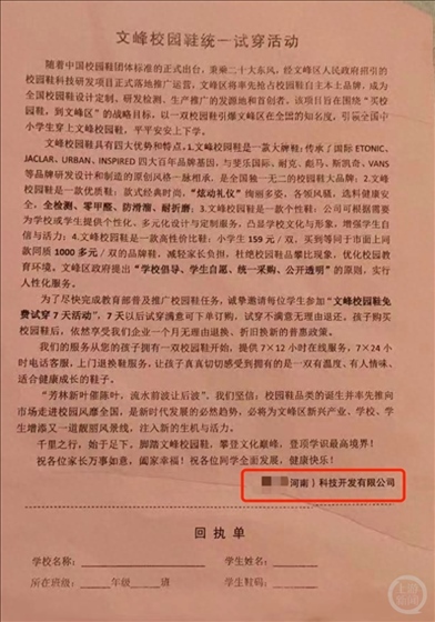·無工商登記的科技公司在河南安陽推廣校園鞋,159元一雙,教育局:“是有校園鞋試穿活動,對公司情況不清楚。”涉事公司:公司名字寫錯了。