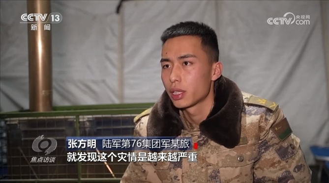 陸軍第76集團(tuán)軍某旅章新禹:“據(jù)我們了解,他家五間房屋全部開裂,家人在院子里面搭了一個(gè)帳篷,我們優(yōu)先讓他回去解決自己的事情,然后再返回部隊(duì)?!?/p>
