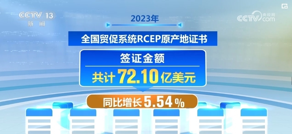2023年,全國貿(mào)促系統(tǒng)RCEP原產(chǎn)地證書簽證金額共計72.10億美元,同比增長5.54%;簽證份數(shù)共計21.81萬份,同比增長38.15%。