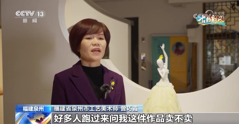 福建省泉州市工藝美術師 曾巧霞:這件作品是以芭蕾舞的形式去表現(xiàn)的,然后結合我們德化這種薄胎和手捏花的工藝來表現(xiàn)整件作品。我把這件作品帶到國博去展出,好多人跑過來問我賣不賣,現(xiàn)在不是沒人要,是訂單多到已經做不出來的問題了。