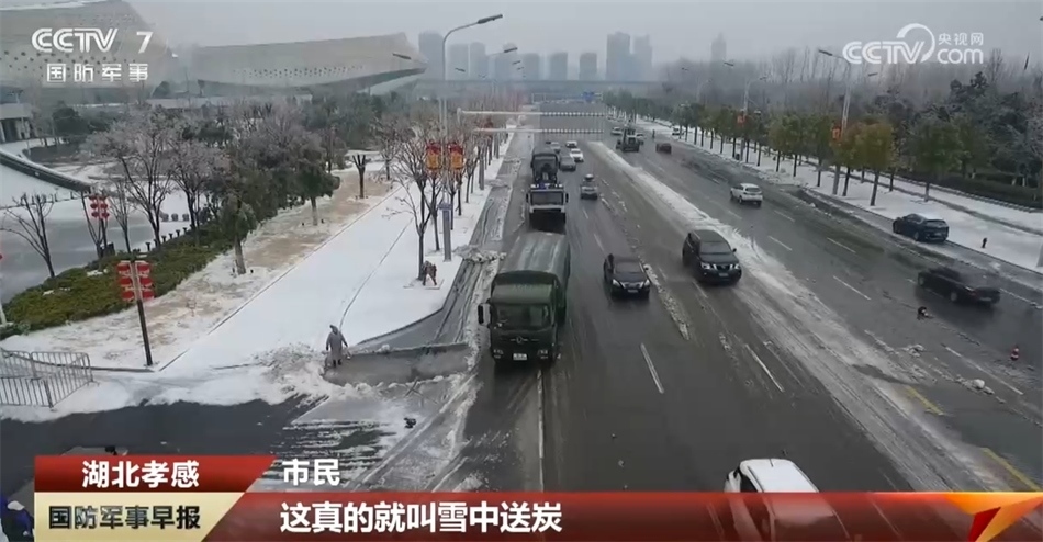 央視網(wǎng)消息:受連日強冷空氣影響,中部地區(qū)出現(xiàn)大范圍寒潮,湖北省孝感市因雨雪天氣,導致道路結(jié)冰濕滑,城市道路交通嚴重受阻。武警孝感支隊緊急出動80多名官兵,支援地方破冰除雪,為受困車輛提供幫助,確保城市重點路段和主干道暢通。