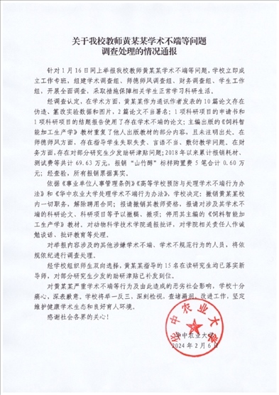 ·華中農(nóng)業(yè)大學通報教師黃某某學術不端等問題:撤職、解聘,其指導的15名研究生均已落實新導師。