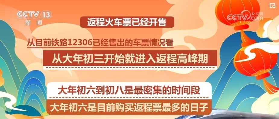 春節(jié)的返程火車票已經開售,從目前鐵路12306已經售出的車票情況看,從大年初三開始就進入大家返程的高峰期,大年初六到初八是最密集的時間段,其中,大年初六是目前購買返程票最多的日子。
