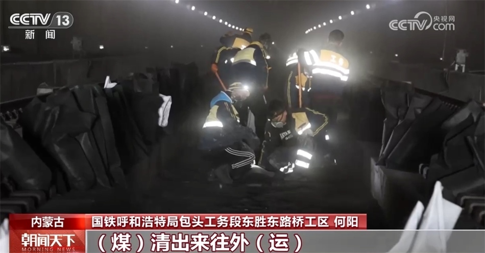 國鐵呼和浩特局包頭工務(wù)段東勝東路橋工區(qū) 何陽:這塊就已經(jīng)(堆)積得相當(dāng)厚了,咱們今天必須抓緊時(shí)間把這個(gè)清出來,煤清出來往外運(yùn),要不然后面影響貨車正常通行。