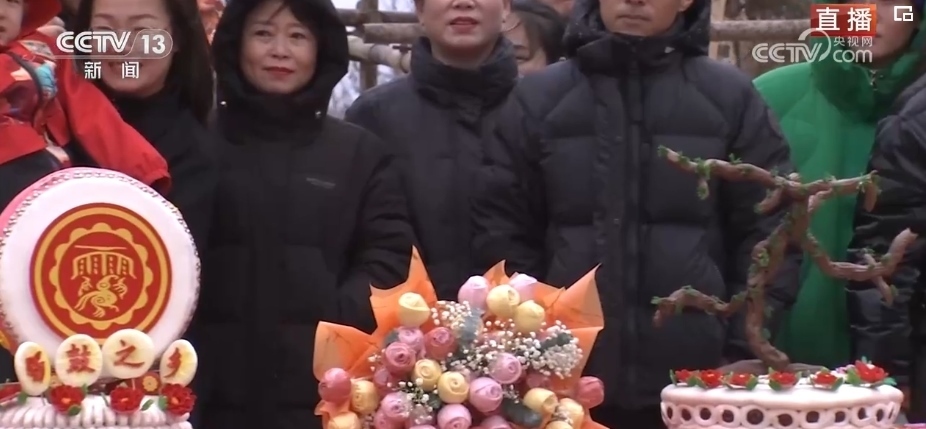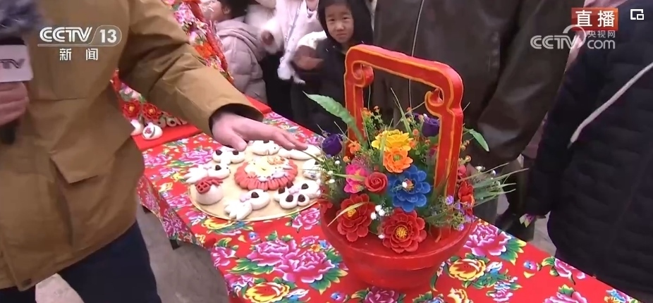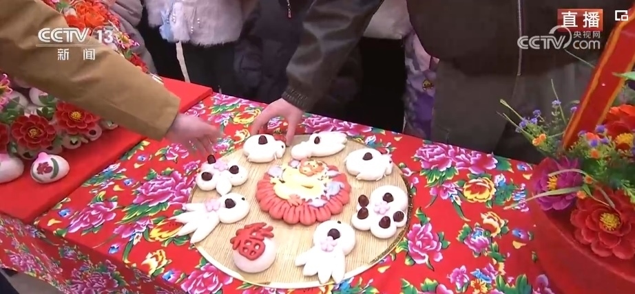 在春節(jié)期間,家家戶戶都會蒸年饃,每個年饃都有不同的寓意,花開富貴、步步高升等,龍年特色的花饃非常熱銷。這個龍型年饃上彩色的元素都是可以食用的,黃色的身子是南瓜汁,藍色是當?shù)匾环N茶葉水調(diào)出來的。