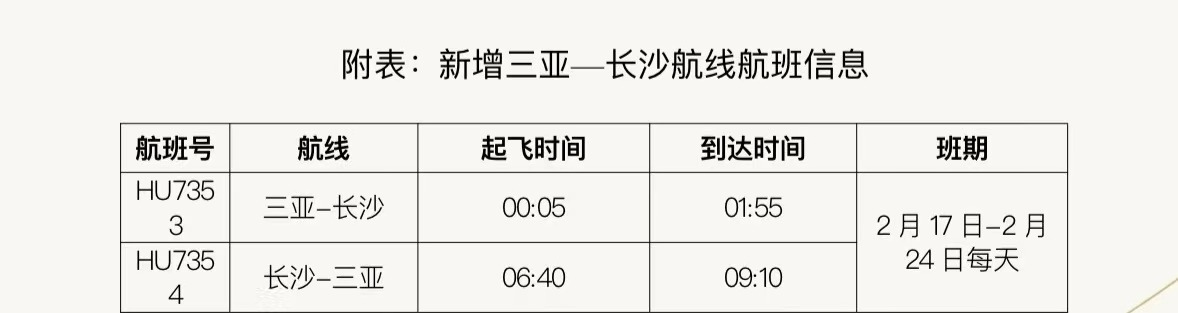 據(jù)悉,在民航局、海南省交通廳的支持下,海南航空積極協(xié)調(diào)申請加班計劃。2月17日至24日期間,海南航空每日新增三亞—長沙往返航班。去程航班HU7353,從三亞起飛時間為凌晨 00:05,到達(dá)長沙黃花國際機(jī)場時間為01:55;返程航班HU7354,從長沙起飛時間為06:40,到達(dá)三亞鳳凰國際機(jī)場時間為09:10,以上航班信息以實(shí)際查詢?yōu)闇?zhǔn)。旅客可通過海南航空官網(wǎng)及APP、微信公眾號及小程序、服務(wù)熱線95339、各直屬售票處及授權(quán)代理購買機(jī)票。