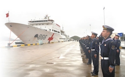 執(zhí)行“和諧使命—2022”任務(wù)的中國海軍“和平方舟”號醫(yī)院船返回浙江舟山某軍港,任務(wù)部隊官兵代表在碼頭迎接?!昂推椒街邸碧栣t(yī)院船是我國自主設(shè)計建造的首艘制式遠洋醫(yī)院船。自2008年入列以來,該船以“和諧使命”任務(wù)為主要載體,多次遠赴海外開展人道主義醫(yī)療服務(wù)。孫 飛攝(新華社發(fā))
