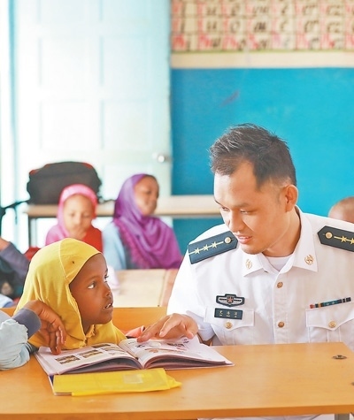 中國人民解放軍駐吉布提保障基地官兵與吉小學(xué)生交流。中國軍隊在吉布提建設(shè)保障基地,是中吉兩國政府經(jīng)過友好協(xié)商作出的決定,為中國軍隊執(zhí)行護航、維和任務(wù)等提供有力保障。30多年來,我國已派出維和人員5萬余人次,赴20多個國家和地區(qū)參加聯(lián)合國維和行動。王宗洋攝(影像中國)