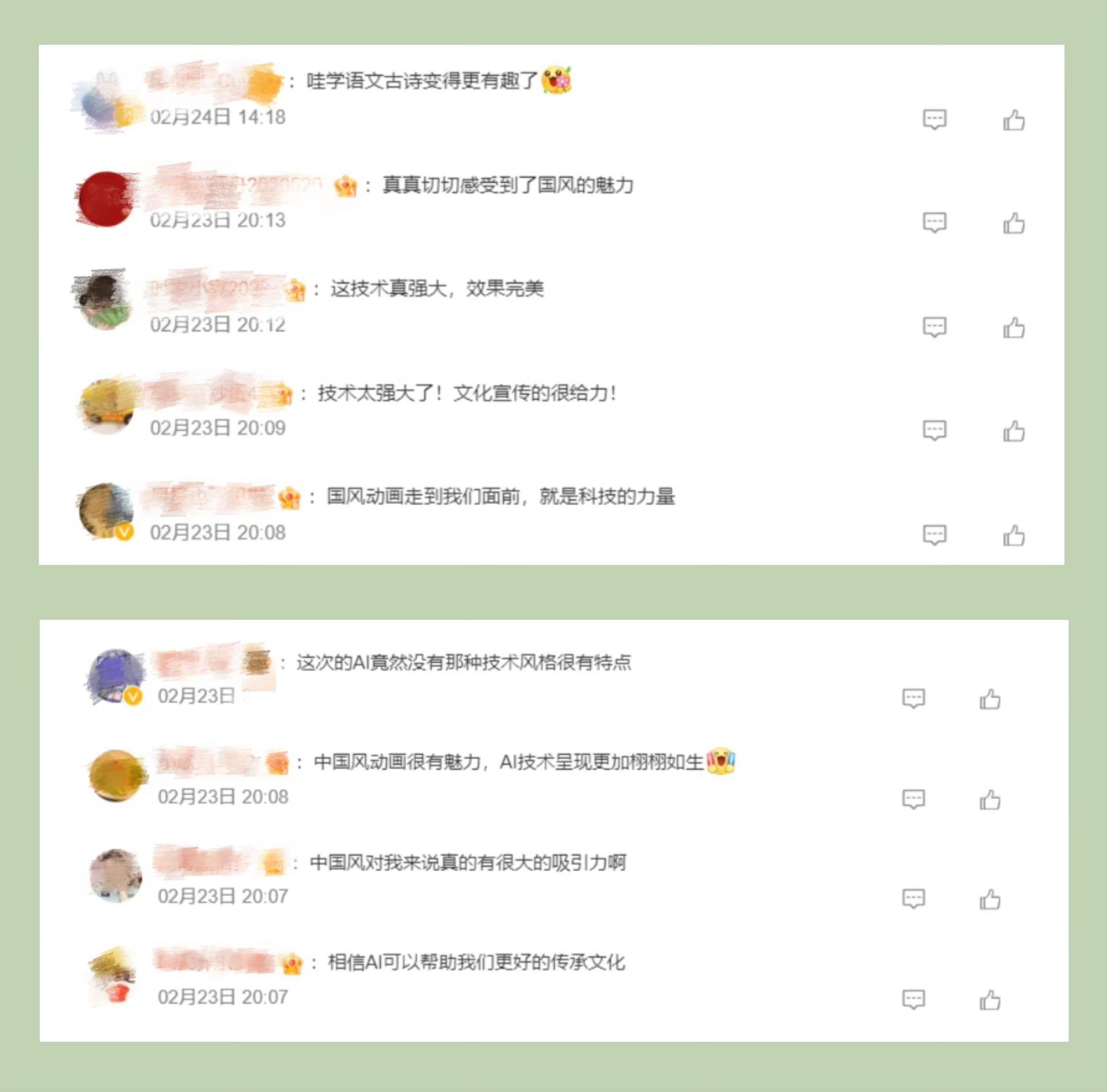 節(jié)目探索詩畫融通的國風(fēng)動(dòng)畫片新呈現(xiàn),讓廣大青少年進(jìn)一步加深了對中國經(jīng)典詩詞的理解和喜愛。“AI”“總臺”“千秋詩頌”等成為網(wǎng)友熱議高頻詞。截至2月27日20:00,話題#千秋詩頌#閱讀量超791萬次。網(wǎng)友紛紛留言:“看到這個(gè)系列片,我真的深深感受到了中國傳統(tǒng)文化的深厚底蘊(yùn)。這些古詩詞深入骨髓,流淌在我們的血液中,是我們國家的文化符號”“以AI為媒,央視制作的這部國風(fēng)動(dòng)畫片傳承了經(jīng)典,喚醒了古韻的新生命”“唯美的畫面讓人動(dòng)容,用視覺的形式了解《別董大》這一首古老的詩歌更別有一番韻味”“這種科技與動(dòng)畫片的結(jié)合,恰好是現(xiàn)在小朋友們和大朋友們所需要的”。