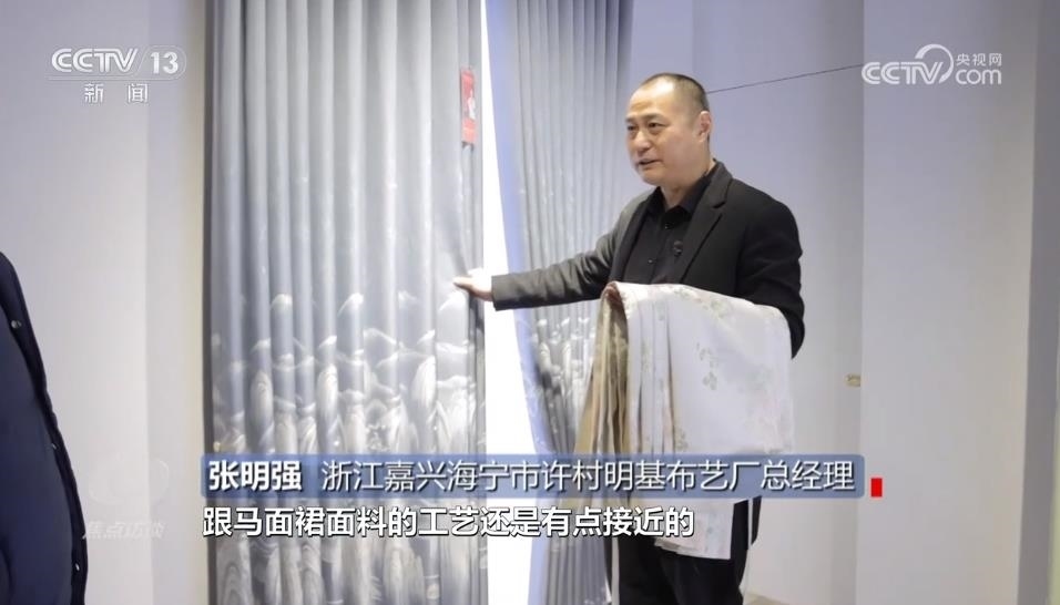 浙江嘉興海寧市許村明基布藝廠總經(jīng)理張明強(qiáng):“提花其實(shí)比較接近,跟馬面裙面料的工藝有點(diǎn)接近,但是馬面裙的密度會(huì)超過它很多。”