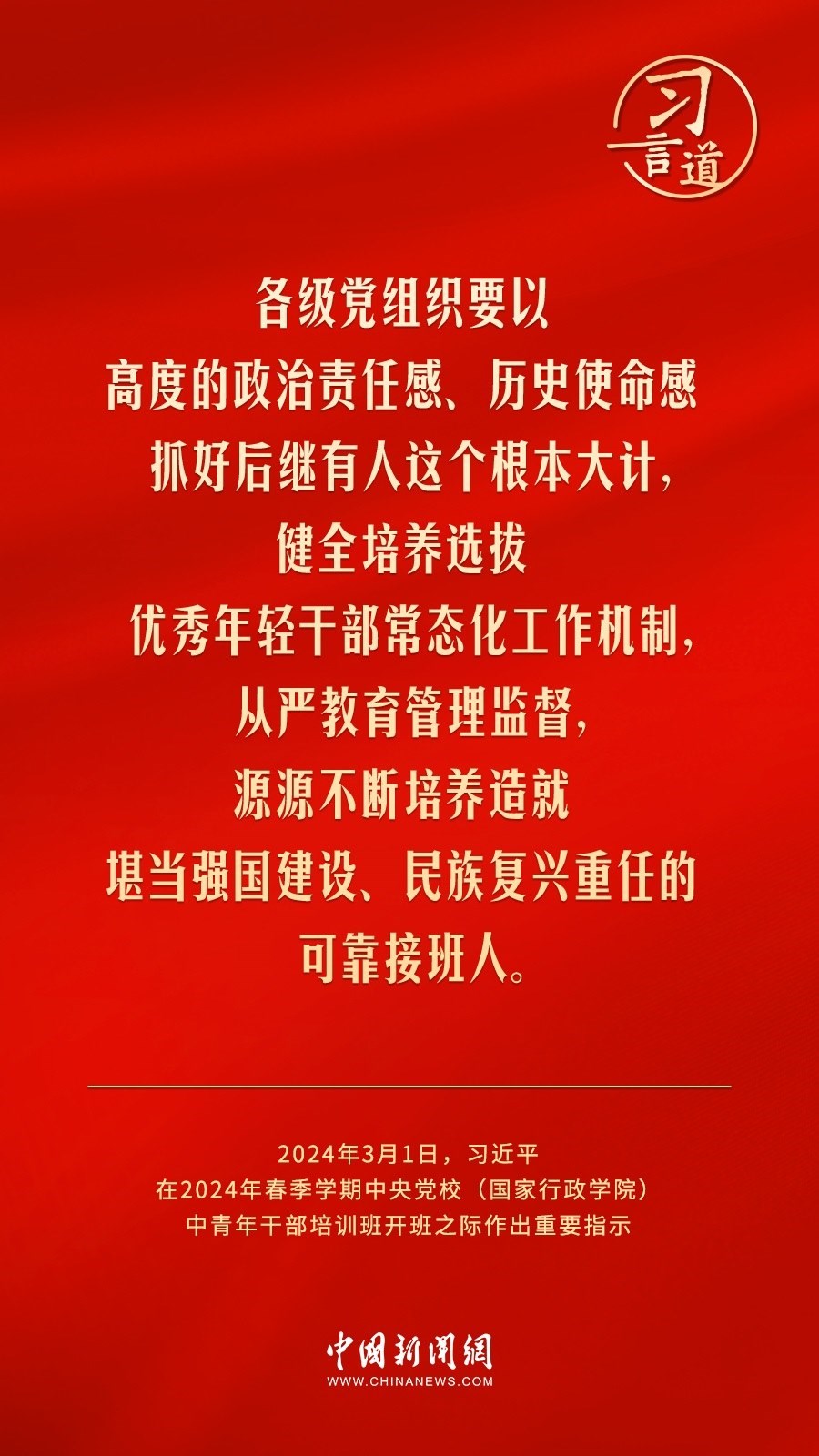 2024年春季學期中央黨校(國家行政學院)中青年干部培訓班3月1日上午在中央黨校開班。中共中央總書記、國家主席、中央軍委主席習近平作出重要指示,他強調——