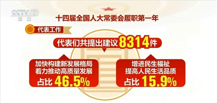 代表工作方面:十四屆全國人大一次會議期間,代表們共提出建議8314件,目前已經(jīng)全部辦理完畢并答復(fù)代表。其中,涉及加快構(gòu)建新發(fā)展格局、著力推動高質(zhì)量發(fā)展的占比46.5%,涉及增進民生福祉、提高人民生活品質(zhì)的占比15.9%。