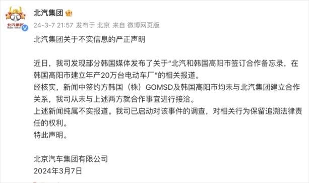 ·北汽集團聲明:“在韓國高陽建廠”信息不實。