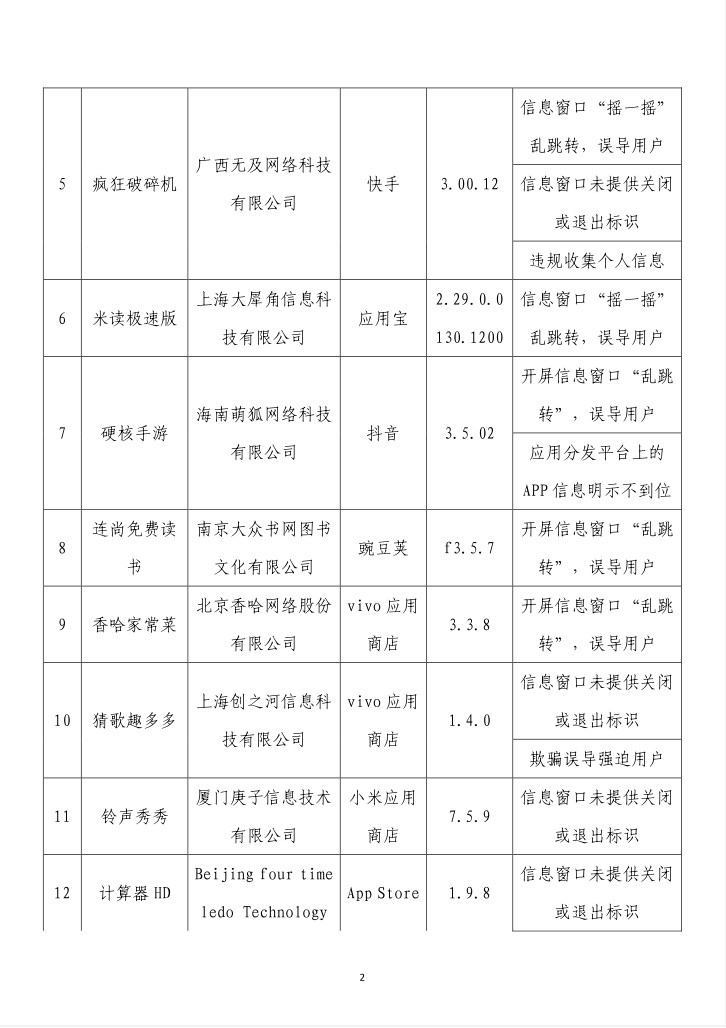 工業(yè)和信息化部高度重視用戶權益保護工作,依據(jù)《個人信息保護法》《網絡安全法》《電信條例》《電信和互聯(lián)網用戶個人信息保護規(guī)定》等法律法規(guī),持續(xù)整治APP侵害用戶權益的違規(guī)行為。近期,工業(yè)和信息化部組織第三方檢測機構對用戶反映突出的“搖一搖”亂跳轉、信息窗口“關不掉”以及違規(guī)收集使用個人信息等問題進行檢查,共發(fā)現(xiàn)62款APP及SDK存在侵害用戶權益行為,現(xiàn)予以通報。