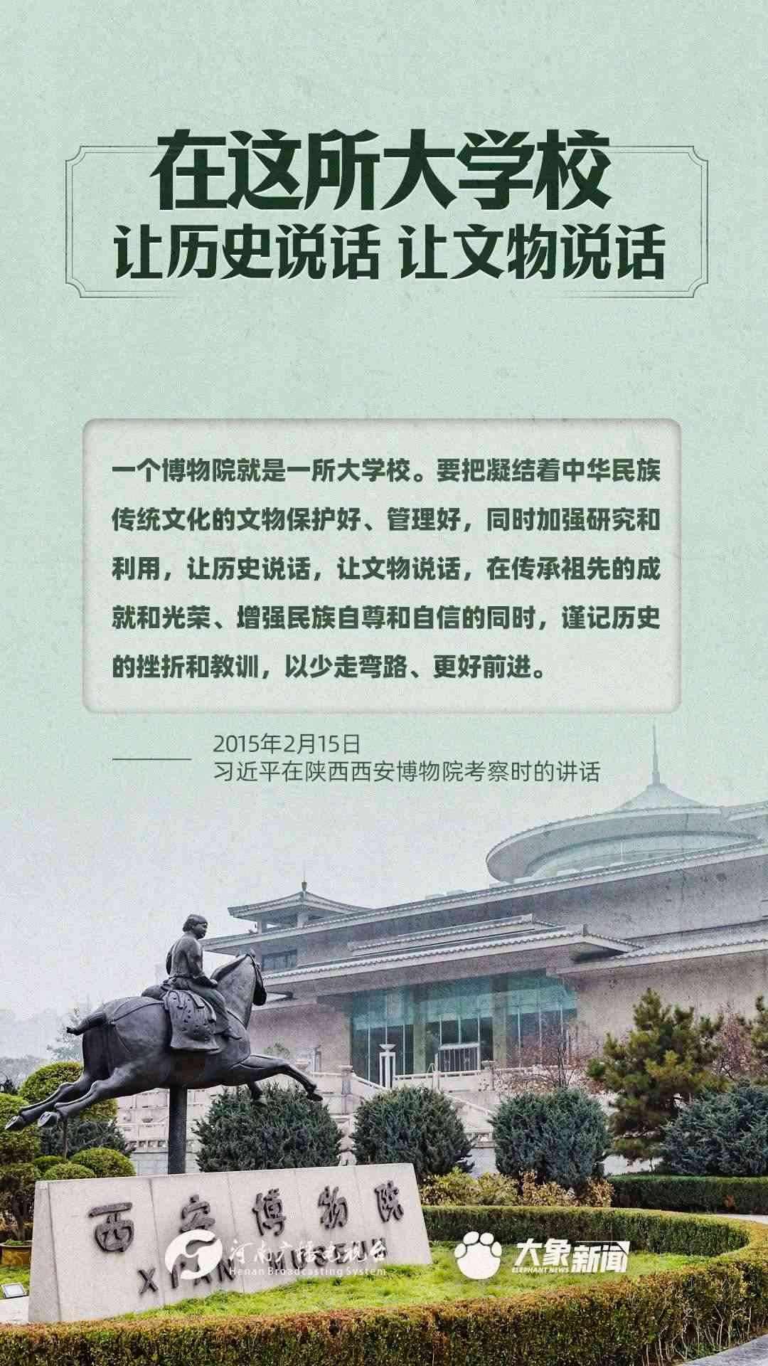 習(xí)近平總書記一直高度重視博物館工作,多次作出重要講話,強(qiáng)調(diào)“一個(gè)博物院就是一所大學(xué)?!?,指出“讓歷史說話,讓文物說話”,要求“守護(hù)好、傳承好、展示好中華文明優(yōu)秀成果”等等,金句連連。大象新聞進(jìn)行了認(rèn)真梳理,邀您一起學(xué)習(xí)。