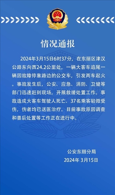 ·天津一輛大客車追尾一輛因故障??柯愤叺墓卉?,引發(fā)兩車起火,事故造成大客車駕駛人死亡、37名乘客輕微受傷。